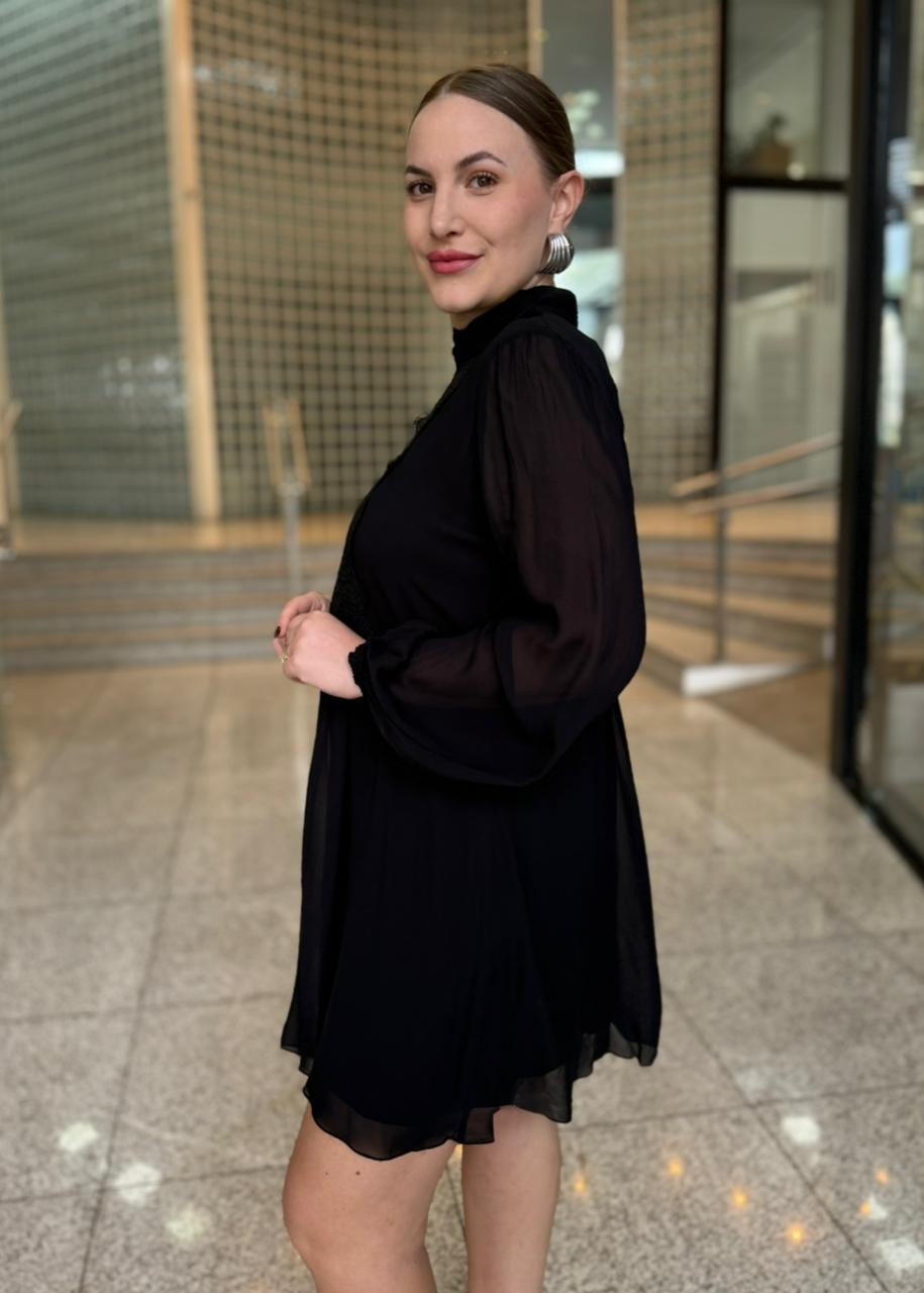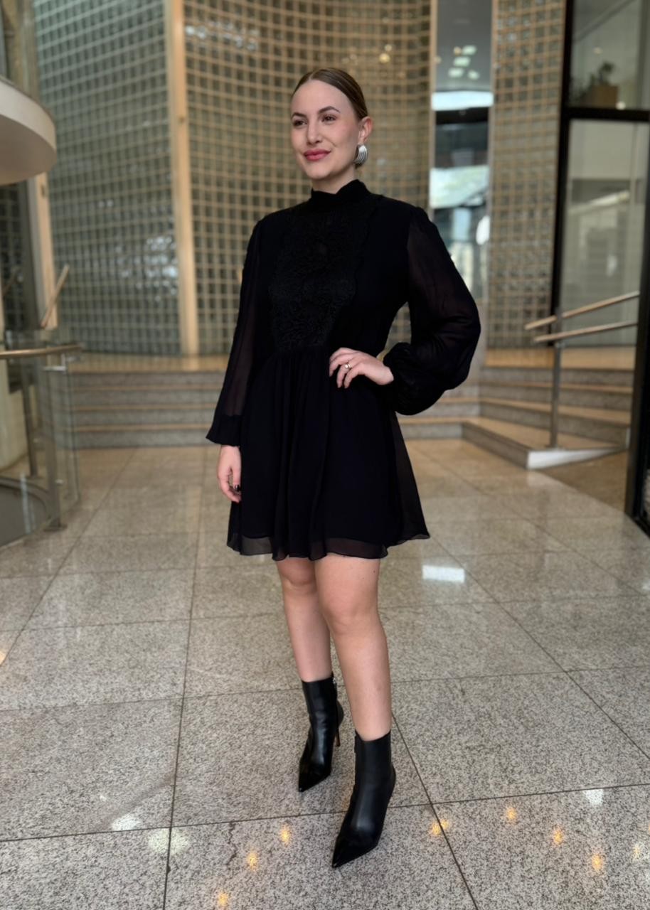 O Vestido Lívia com Renda da Animale é a união perfeita entre delicadeza e impacto. O preto absoluto ganha leveza com a transparência das mangas e romantismo sofisticado com os detalhes em renda, enquanto a modelagem fluida cria movimento e um caimento impecável. O decote fechado contrasta com as costas abertas, revelando sensualidade na medida certa.