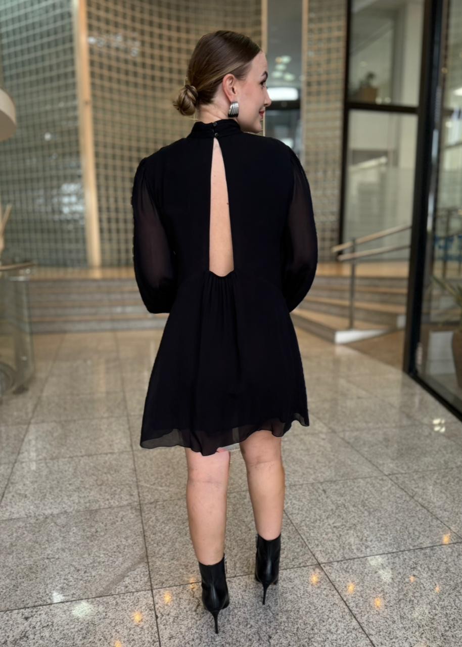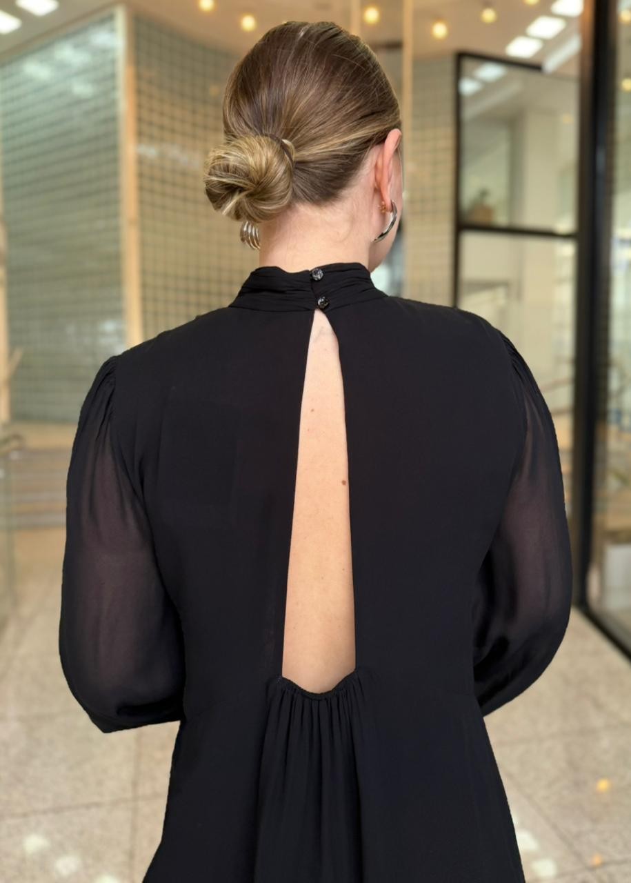 Confeccionado em tecido leve e esvoaçante, traz mangas longas transparentes com volume sutil, recortes de renda que enriquecem a peça e saia com fluidez elegante. A abertura nas costas surpreende e transforma o vestido em uma escolha ainda mais especial.