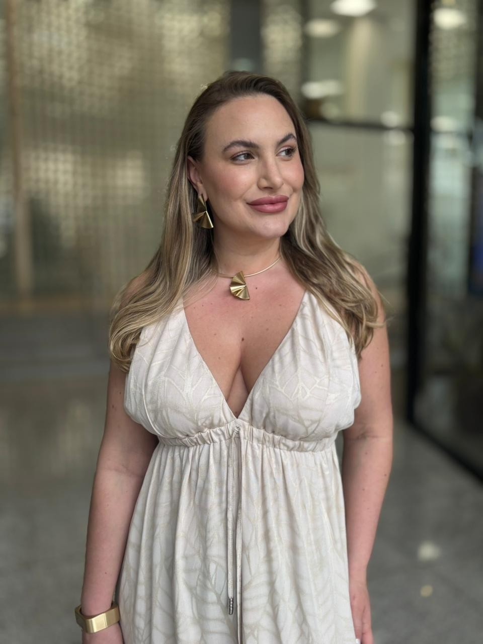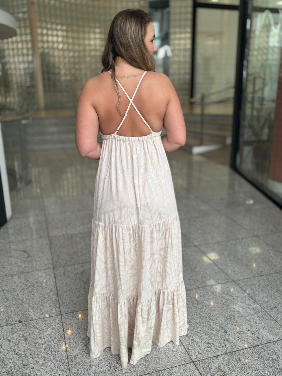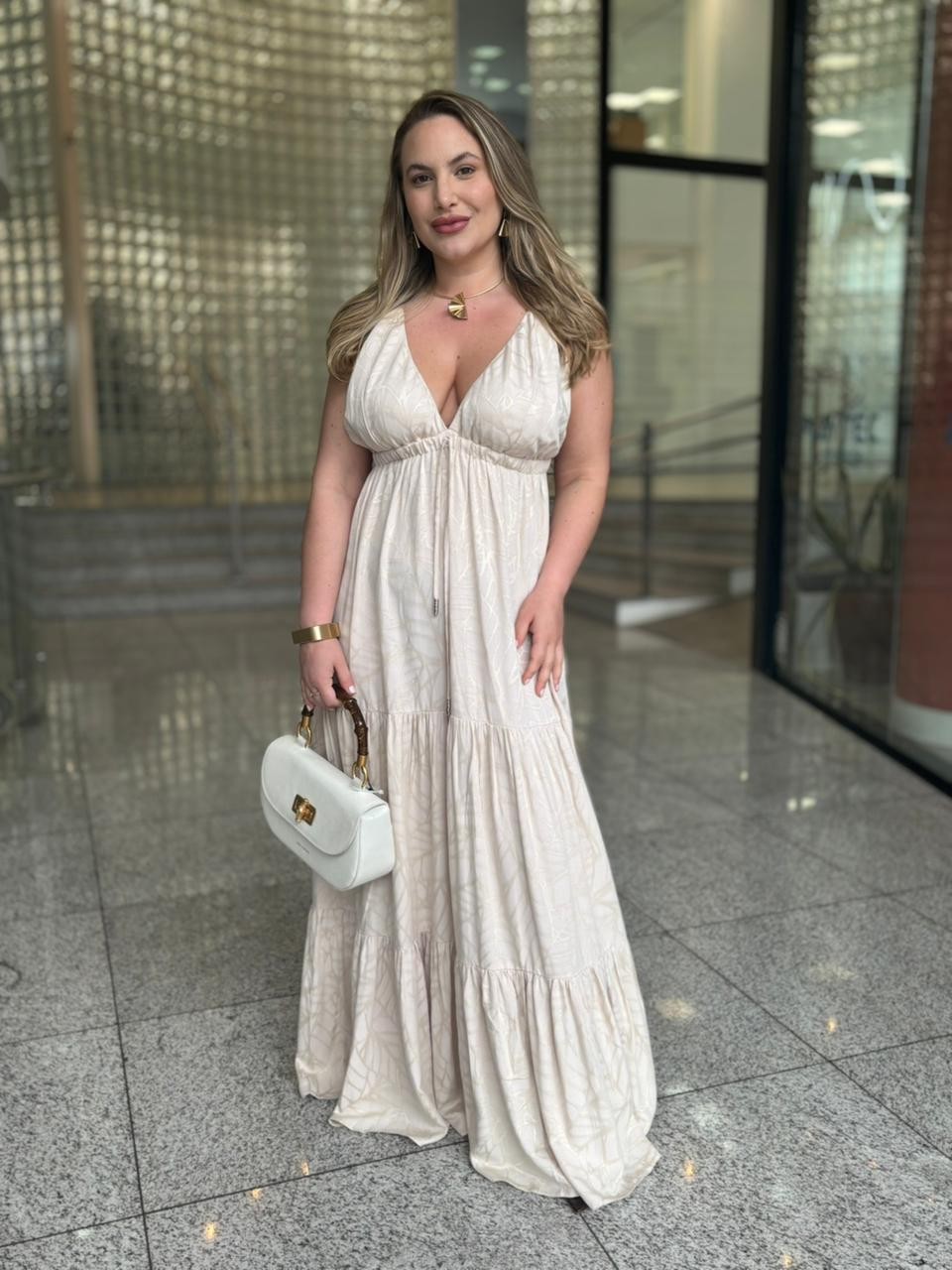 Confeccionado em tecido leve e macio, o vestido possui modelagem longa com recortes em babados que criam fluidez e charme. O decote em V profundo valoriza o colo, enquanto as alças finas cruzadas nas costas adicionam um toque de sensualidade sutil.