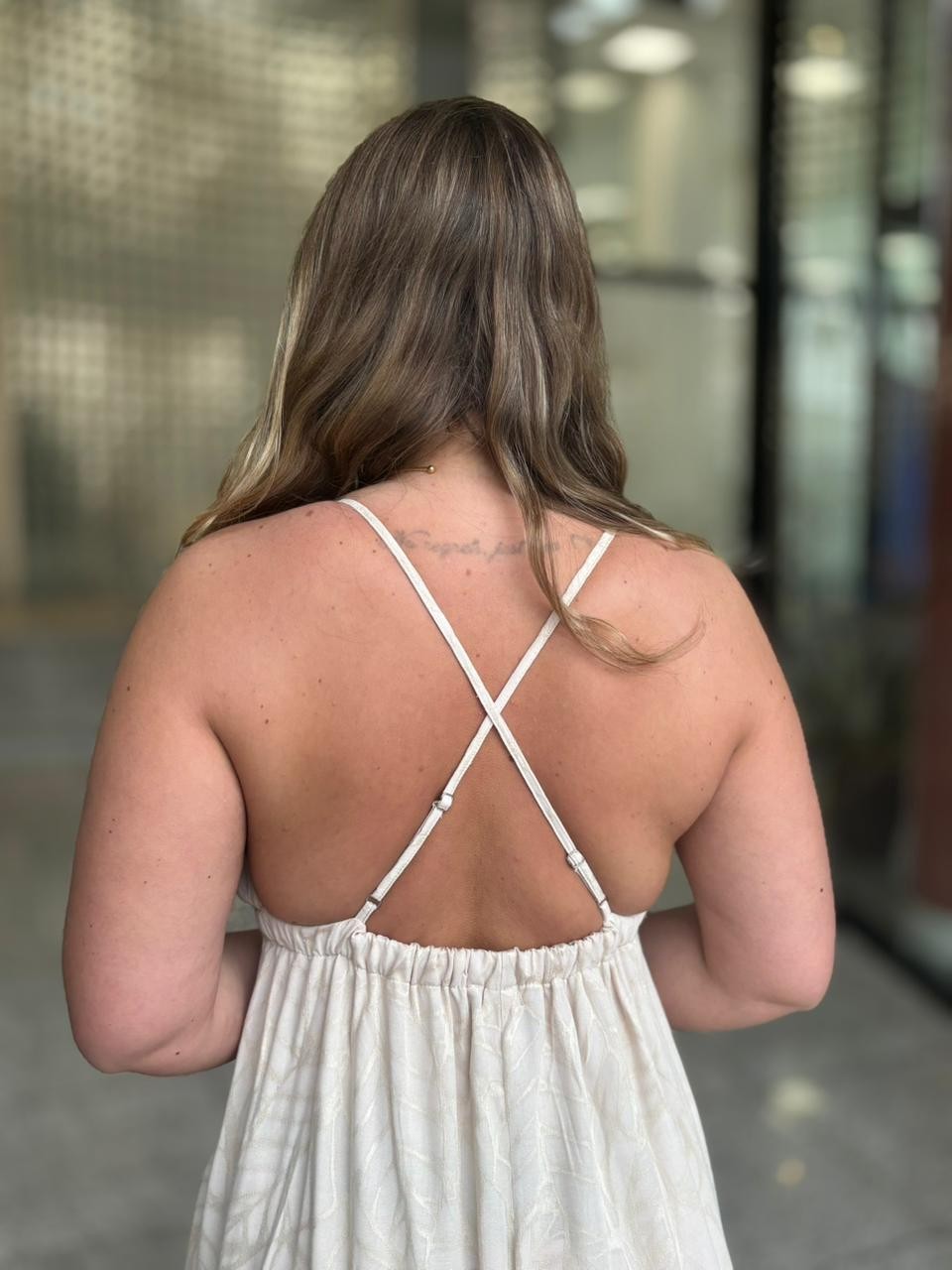 Design: Decote V, costas abertas com alças cruzadas, recortes em babados e caimento fluido