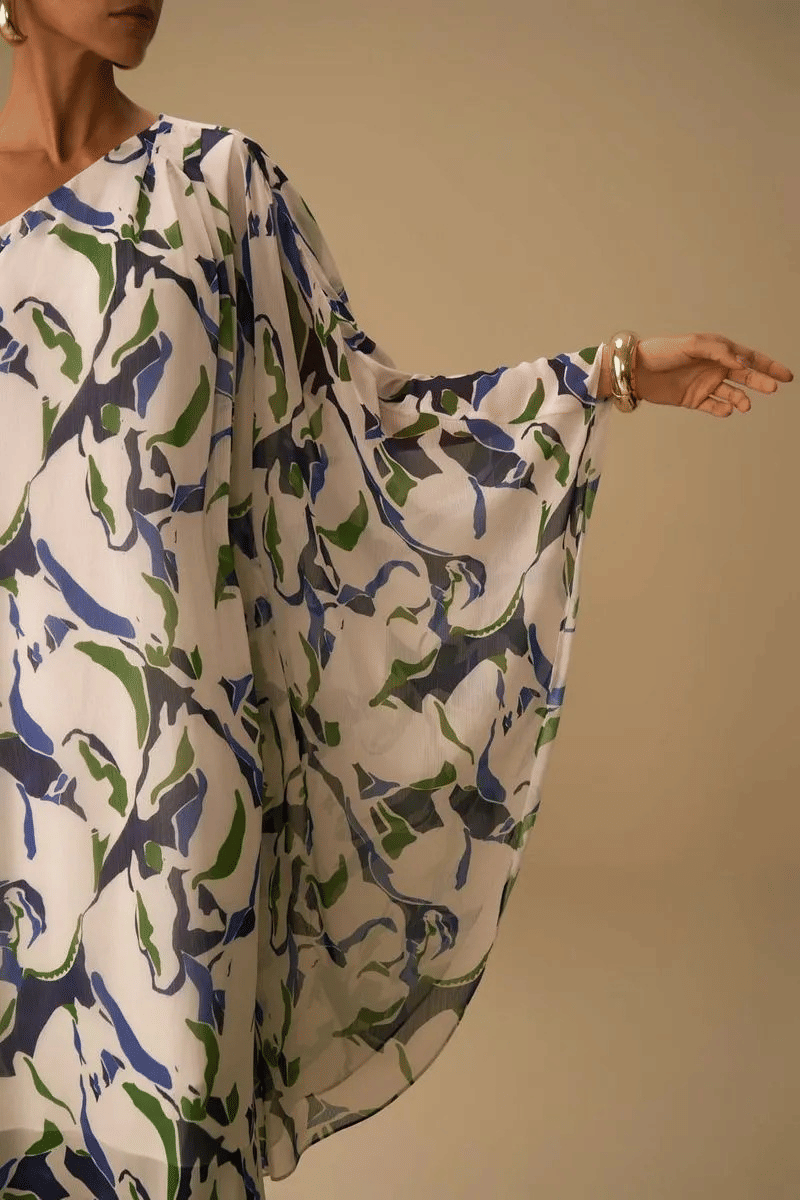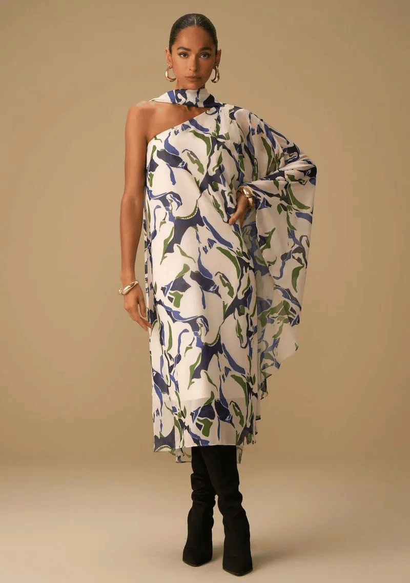 Confeccionado em tecido leve e transparente, com forro para maior conforto, o vestido apresenta caimento solto e movimento fluido. O design assimétrico valoriza o colo e os ombros, enquanto a manga ampla em estilo capa cria um efeito esvoaçante e sofisticado. O comprimento midi equilibra modernidade e elegância, tornando a peça ideal para diferentes ocasiões, do coquetel à produção noturna sofisticada.